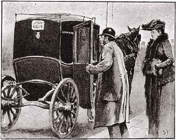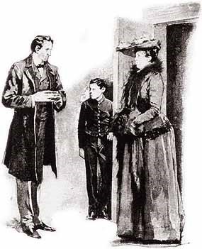 Leviĝinte de sia seĝo, li staris inter la disigitaj kurtenoj rigardante malsupren al la griza, monotona londona strato. Rigardante trans lia ŝultro, mi vidis, ke granda virino staras sur la pavimo kontraŭe. Peza, pelta boao ĉirkaŭis ŝian kolon, kaj estis kurba, ruĝa plumego en ŝia larĝ-randa ĉapelo, kiu estis klinita super ŝia orelo, en la koketa modo de la Dukino de Devonshire. De sub ĉi tiu granda panoplio, ŝi gvatis nervoze kaj hezite supren al niaj fenestroj, dum ŝia korpo balanciĝis antaŭen-malantaŭen, kaj ŝi fingrumis la butonojn sur siaj gantoj. Subite, plonĝante, kiel naĝanto de la bordo, ŝi hastis trans la vojon, kaj ni aŭdis la akran sonoron de la sonorilo.
