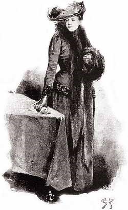 “Ŝi havis ardezkoloran, larĝrandan pajloĉapelon, kun plumo brikece ruĝa. Ŝia jako estis nigra, kun nigraj bidoj alkudritaj, kaj franĝo el etaj, nigraj, gagataj ornamaĵoj. Ŝia robo estis bruna, iom pli malhela ol la koloro de kafo, kun iomete da purpura pluŝo ĉe la kolumo kaj la manikoj. Ŝiaj gantoj estis pale grizaj, kaj la ŝtofo estis tra-trivita ĉe la dekstra antaŭfingro. Ŝiajn botojn mi ne observis. Ŝi havis malgrandajn, rondajn, pendantajn orelringojn, kaj ĝenerala aspekto de persono, kiu vivas sufiĉe bone, sed en maniero vulgara, komforta, kaj senĝena.