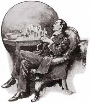 Ŝerlok Holms sidis silenta dum kelkaj minutoj, kun la fingropintoj ankoraŭ kunpremitaj, liaj kruroj etenditaj antaŭ si, kaj lia rigardo direktita al la plafono. Tiam li malsupren prenis de la rako la malnovan, olean pipon el argilo, kiu estis al li kvazaŭ konsilanto, kaj bruligis ĝin. Li kliniĝis malantaŭen en sia seĝo, dum la dikaj, bluaj fumo-kronoj supren kirliĝis. Estis aspekto de senlima langvoro sur lia vizaĝo.