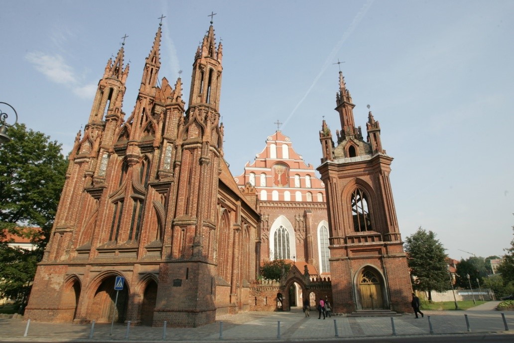 La strateto finiĝas, transformiĝante en malgrandan triangulan placon. Dekstras grandega kruta tegmento de la preĝejo de Sankta Mikaelo kaj antaŭe, rekte ĉe Vilnia, kies plaŭdado aŭdeblas en la silento de la somera nokto, suprenleviĝas severaj, seriozaj muroj de la Bernardana preĝejo. Flugetas foren la nuba ombro, plilumiĝas paciĝintaj ĉeriveraj arboj. La sonorilturo de Bernardanoj... Ĉu vidas vi, kiel el mallumo elnaĝas konstruaĵo de mirinda gracieco kaj leĝereco. La streĉita arko de fasado suprenlevas la centran turon, ĉiuj fasadaj linioj, kurbiĝante, tremante kuras supren, kaj ŝajnas, ke ilia movado ne ĉesas sur turopintoj, sed iras supren, pli supren, tien, kien strebadas la homa koro dum longaj jarcentoj. Estas tiom da libero, da leĝereco en tiu supreniro, ke spektante supreniĝas ankaŭ via animo, malpezas en via brusto kaj ekbrilas via spirito. Tio estas la preĝejo de Sankta Anna. Ĝi aspektas tiom malpeza, ke ŝajnas al vi, ke vi prenus kaj metus ĝin sur sian eltenitan polmon. La kurantaj jarcentoj ne aŭdacis tuŝi ĝian belecon, do eĉ hodiaŭ ĝi staras, kia estis konstruita antaŭ pli ol kvarcent jaroj. Rigardu pli atenteme. Ĉu vi vidas? La subo de la fasado estas glata, monotona, nur pli supre ekas la mirinda ludo de linioj. Kvazaŭ alia mano estus transpreninta la krajonon de la arkitekto, ĉu? Sidiĝu kaj aŭskultu.