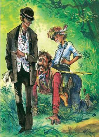 Post proksimume duonhoro mi aŭdis la arbustojn susuri, kaj Bill elŝanceliris en la malgrandan senarbejon antaŭ la kaverno. Malantaŭ li estis la infano, paŝanta mallaŭte kiel skolto, kun larĝa rideto sur la vizaĝo. Bill haltis, demetis sian ĉapelon kaj viŝis sian vizaĝon per ruĝa tuketo. La infano haltis proksimume ok futojn post li.