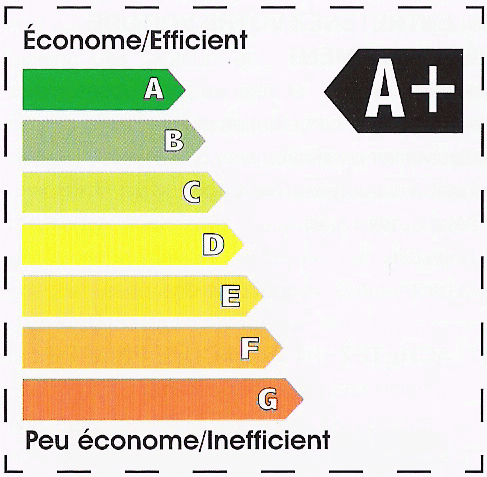 En la elektro-aparataj magazenoj, energimarko estas sur ĉiu aparato kia: fridujo, superfrostujo, elektra forno aŭ tuklavilo. Ĝi respondas al klasifiko de A ĝis G: la aparatoj en klaso A (t.e. AAA, A+ kaj A++ laŭ la aparato-tipo) estas nete pli ŝparigaj kaj do multe malpli poluas. La aparatoj en klaso B estas malpli bonaj laŭ efikeco, ktp, la aparatoj en klaso G estas evitendaj. La maŝinoj en klaso A estas iom pli kostaj sed vi profitas je aĉetaj monpremioj .
