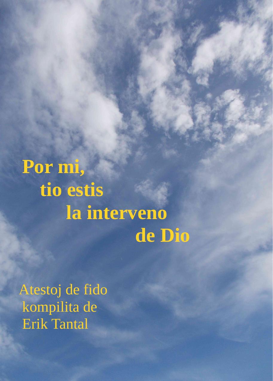 Atestoj - „Por mi, tio estas la interveno de Dio“ - Atestoj de fido - de Erik Tantal Nuntempe ne estas memkompreneble raporti pri viaj propraj spertoj rilate al via kredo. Estas tute eble ke via kontraŭulo sulkas la brovojn, ĉar neniu povas provi ke vere estis rekta interveno de Dio. Tiuj kompilitaj rakontoj estas ĉiu skribitaj el la persona perspektivo de la rakontanto. Eble ĉi tiu kolekto povas simple inspiri la leganton pripensi kaj miri.