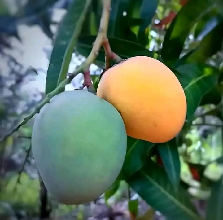 La du mangoj kreskiĝas sur la sama branĉo de la arbo. Unu el ili jam estas matura, dum la alia ankoraŭ bezonas tempon por atingi plenan maturecon.